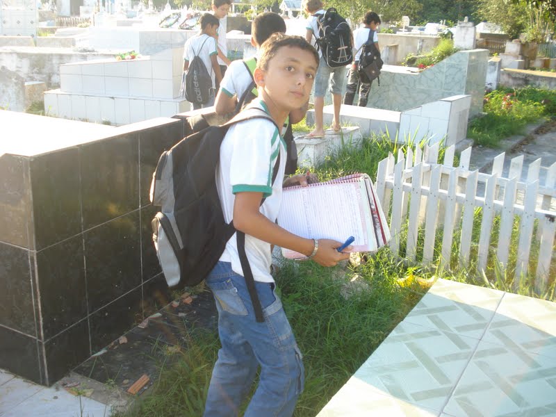 A professora de Ciências Silvia Lessa com sua turma do 6º Ano “D” faz visita ao cemitério São João Batista.